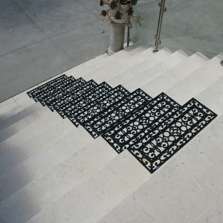顾名思义,这款橡胶踏脚垫将为您的家带来高贵的品味。这些装饰性橡胶楼梯踏板的设计融合了过去几个世纪欧洲皇室流行的设计图案的标志。该主题融合了带有花卉边框图案的四角星,这种设计风格在凡尔赛宫或汉普顿宫很容易找到。此外,这些垫子中的再生橡胶使其成为相当时尚的生态地板。